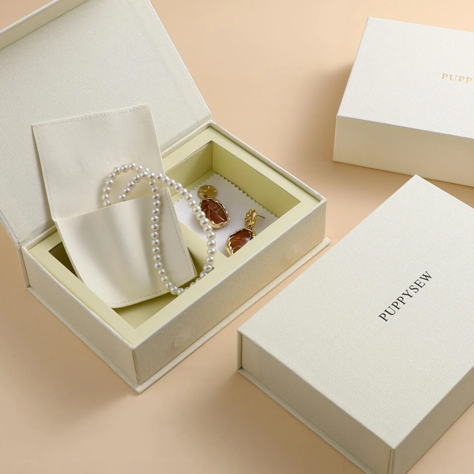 PUPPYSEW Customizable logo-printed jewelry box with internal card slots, comes with a jewelry pouch and polishing cloth